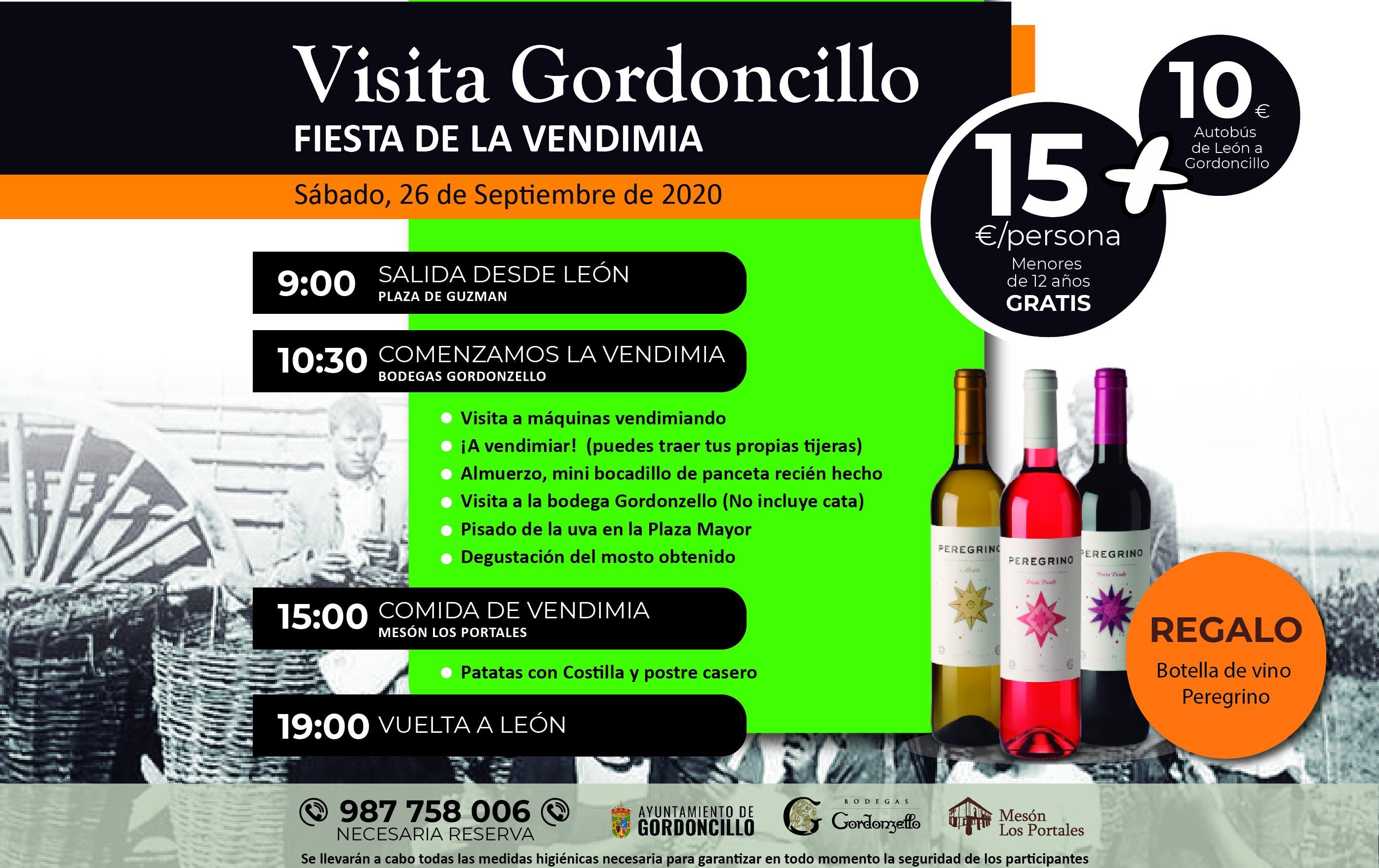 Después nos acercaremos a Gordoncillo donde, en su Plaza Mayor, se realizará el clásico pisado de uva, en el que podrá participar todo el que lo desee y se degustará el mosto obtenido. Posteriormente, en el Mesón Los Portales, se ofrecerá la tradicional comida de vendimia consistente en patatas con costillas y postre casero.