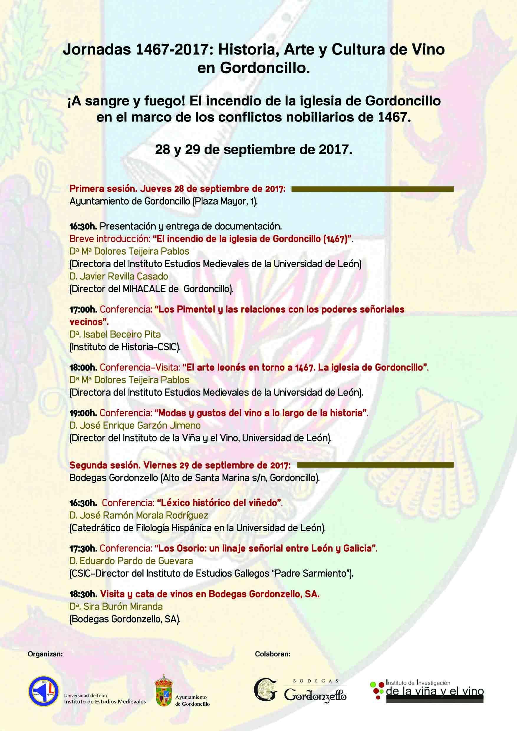 Unas jornadas que darán comienzo el Jueves 28 de Septiembre a las 16:30 en el ayuntamiento de Gordoncillo y en la que dará comienzo hablando del famoso "Incendio de la iglesia de Gordoncillo en 1467" además de varias conferencias que os dejamos en el programa que podéis ver a vuestra derecha.