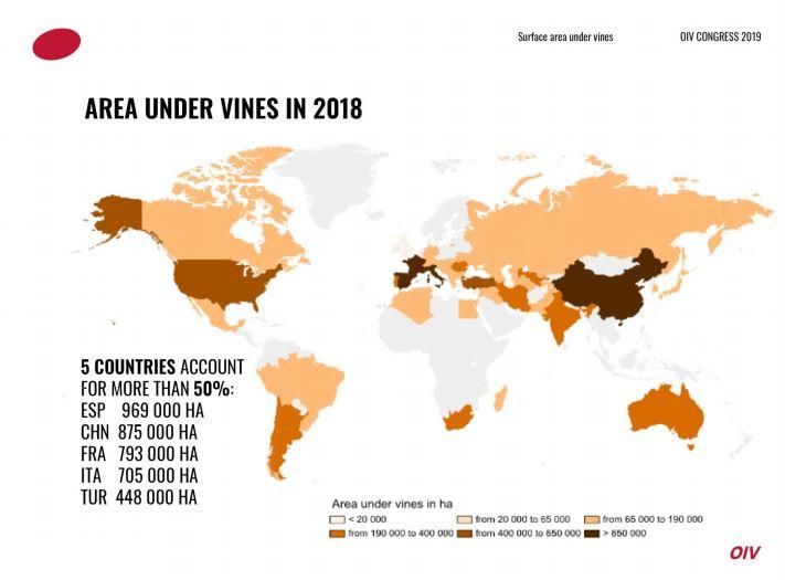 Según el documento de la OIV, la superficie vitivinícola mundial se sitúa en los 7,4 millones de hectáreas, lo cual representa un descenso en los últimos años debida a la disminución de superficie de viñedo en Turquía, Irán y Portugal. España se sitúa en el primer puesto de superficie vitivinícola con 960 mil hectáreas, seguida de China (875 mil hectáreas), Francia (793 mil ha) e Italia (705 mil ha).